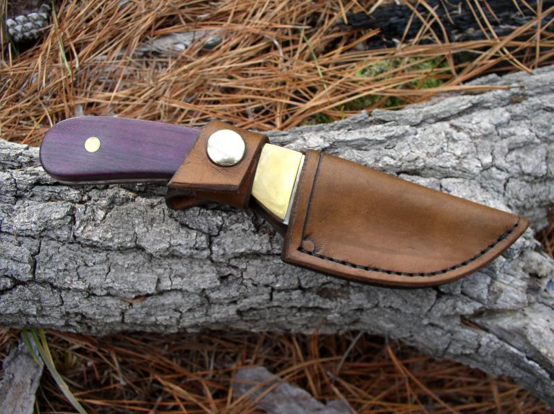 ATS-34 Stainless Steel Blade hardened to 58 on the Rockwell scale. 3" blade, 7" overall length. Brass bolsters and Purple Heart scales.Handmade Leather Sheath.