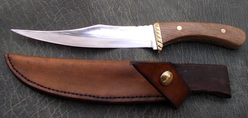 Drop Point Hunter ATS-34 blade hardened to 58 on the Rockwell scale. Blade is 3 1/2 inches long, overall length 7 1/2 inches. Brass bolsters and live oak burl scales. $200.00