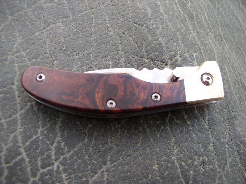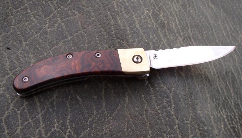 Locking liner folder, blade is 2 1/2" long, at-34 stainless steel. Open length is 6", closed length is 3 1/4". Scales are Desert Ironwood, exhibition grade. Brass bolsters.